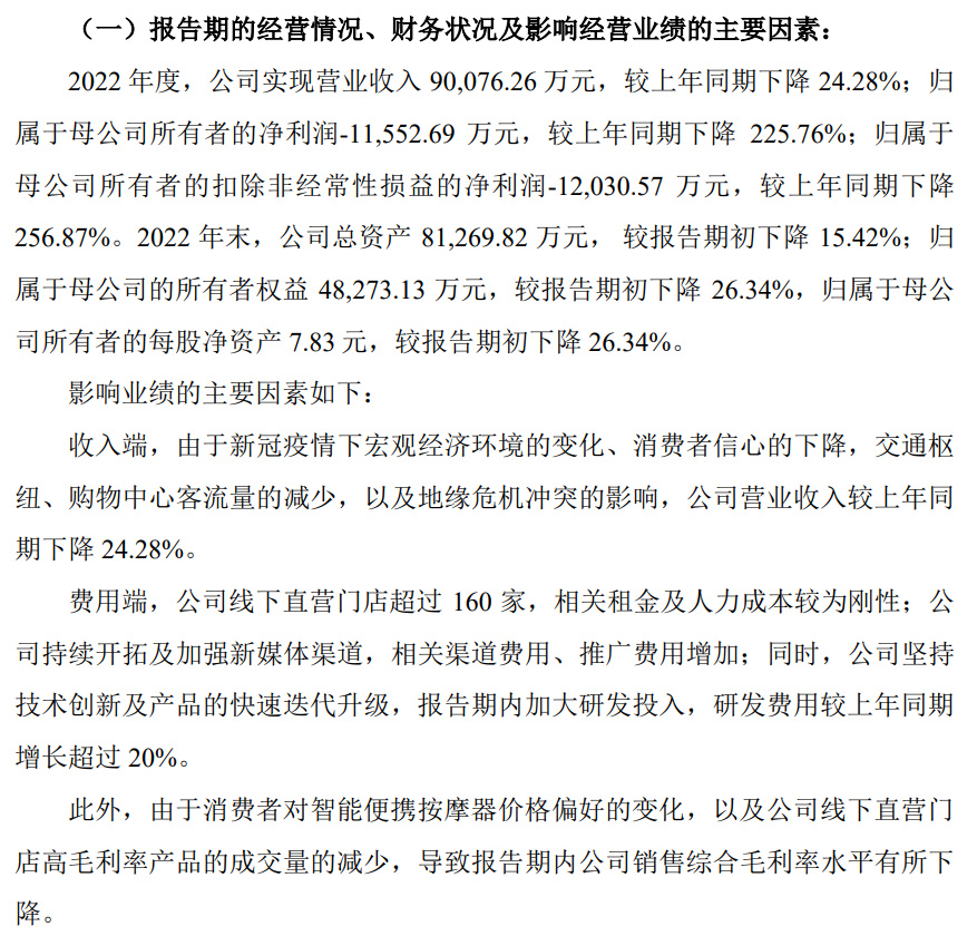 可即便毛利率如此之高,倍轻松还是走到了“亏损”这一地步。根据公司的业绩预告,2022年实现营业总收入9.008亿元,上年同期为11.895亿元,同比下降了24.28%;归属于母公司所有者的净利润为-1.155亿元,上年同期为净利润9186.19万元,同比下降了225.76%。