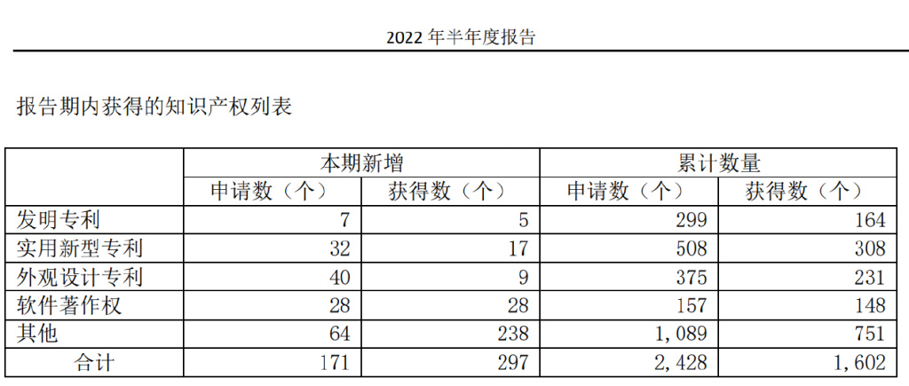 这是公司2022年半年报中披露的专利情况。虽然公司累计获得了多项专利,但大部分都是较容易取得的实用新型专利和外观设计专利,发明专利占比相对较低。