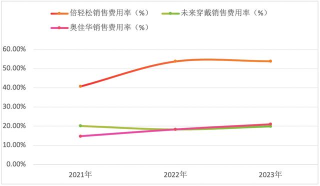 毛利率高的倍轻松销售费用率也很高。2022年,公司销售费用率就高达53.84%,奥佳华、未来穿戴均在18%以上。到了2023年,倍轻松的销售费用率略增至53.94%,两家可比公司则处于20%上下,仍远低于倍轻松。