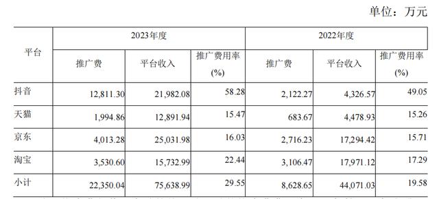 天猫与京东平台的推广费用也大幅增加,两平台的收入增长趋势虽与推广费一致,但平台收入增速均不及推广费用。同时,由于2023年1月至5月,公司在淘宝平台无主推产品,站内销售主要通过付费承接,推广费用较多,转化率较低;6月至12月,新品上线,公司加大投入力度,销售得以提升。整体上,该年度淘宝平台的推广费用上升,平台收入却下降。
