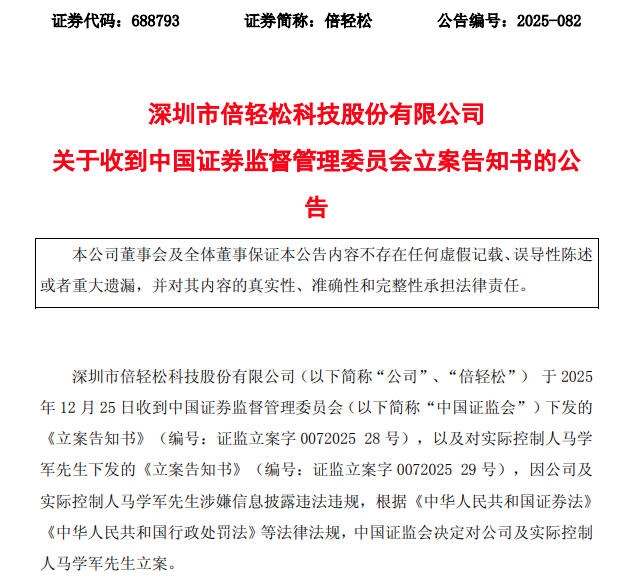 12月25日晚,深圳倍轻松科技股份有限公司(简称“倍轻松”,688793.SH)发布公告,公司于12月25日收到证监会下发的《立案告知书》,因公司及实际控制人马学军涉嫌信息披露违法违规,根据相关法律法规,证监会决定对公司及实际控制人马学军立案。