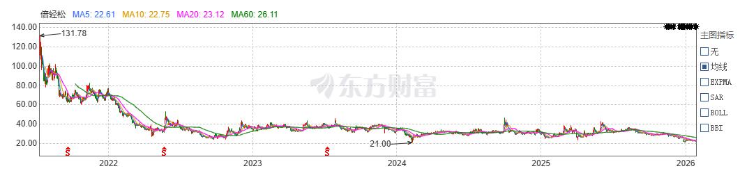 2021年7月15日,倍轻松于科创板上市,开盘报160元,较发行价27.4元上涨484%,市值破百亿。截至1月28日收盘,报收22.1元/股,市值仅剩18.99亿。