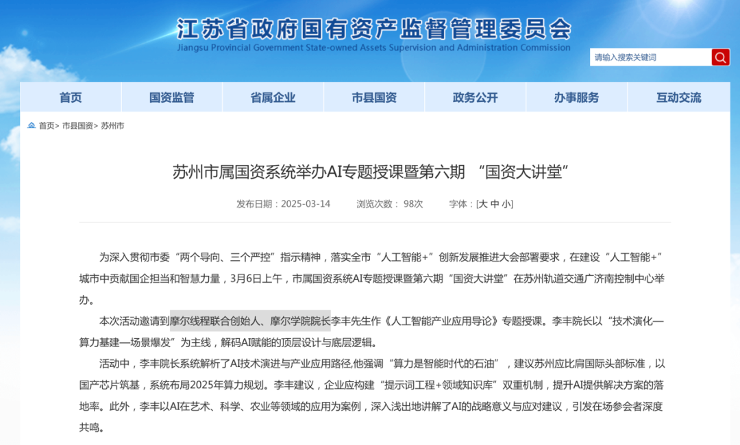 但在一些官方场合,比如在江苏国资委网站上宣传苏州市属国资系统举办AI专题授课暨第六期“国资大讲堂”的文章中,李丰的职务赫然以“摩尔线程联合创始人、摩尔学院院长”展示。