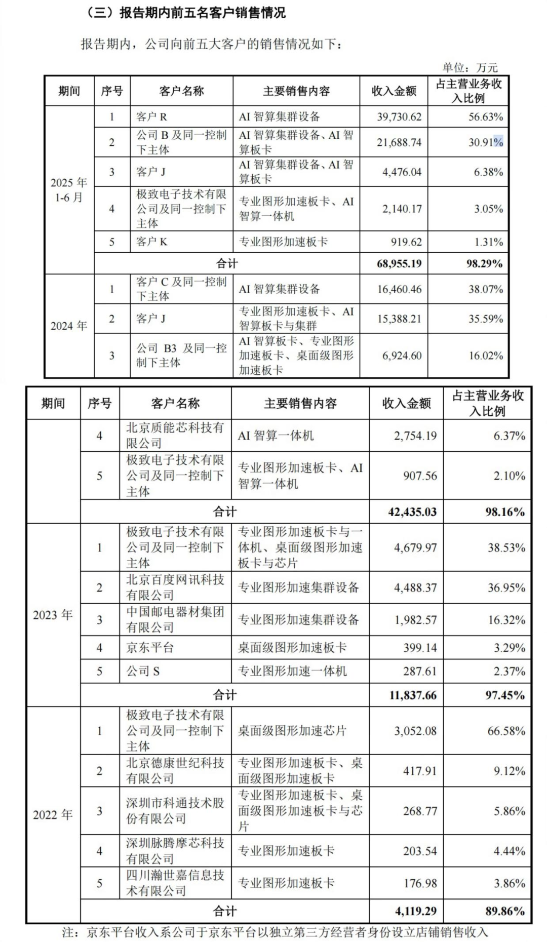 而从客户群体来看,摩尔线程自2022年至2025年上半年,前五大客户收入占比分别为89.86%、97.45%、98.16%和98.29%。尤其在2025年1–6月,前两大客户合计贡献已超过87%的主营收入,其中单个客户贡献56.63%的营业额。这意味着,一旦核心客户采购节奏放缓、预算调整或项目终止,公司的收入与现金流将面临剧烈波动。