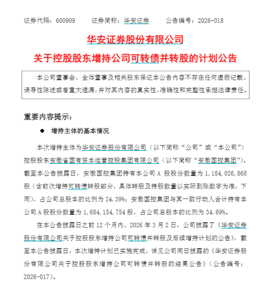 梳理公司权益变动发现,截至2月27日,2026年以来,受可转债持有人陆续转股影响,华安证券总股本有所增加,控股股东安徽国控集团及其一致行动人合计持股比例已由2025年末的35.02%被动稀释至34.44%。