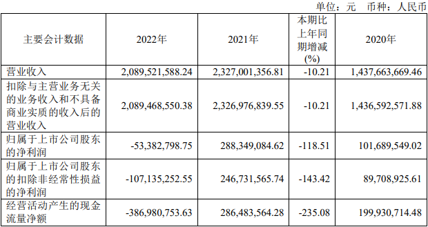2022年,艾为电子实现营业收入20.90亿元,同比下降10.21%;实现归属于上市公司股东的净利润-5338.28万元,同比下降118.51%;实现归属于上市公司股东的扣除非经常性损益的净利润-1.07亿元,同比下降143.42%;经营活动产生的现金流量净额为-3.87亿元,同比下降235.08%。