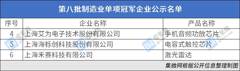 其中,上海艾为电子技术股份有限公司、上海海栎创科技股份有限公司、上海禾赛科技有限公司等11家企业上榜第八批制造业单项冠军企业名单。