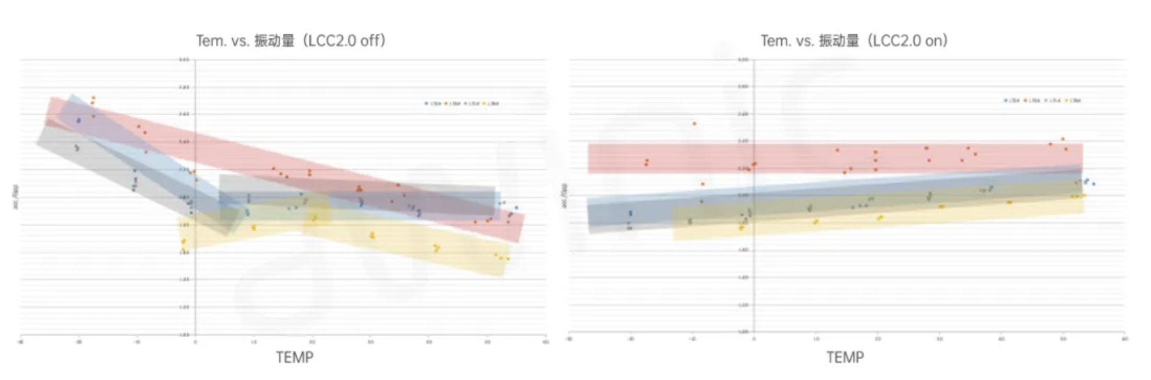 (Temperature compensation,LCC2.0)当环境温度变化时,马达的阻抗和F0都会发生比较明显的变化,此时若驱动信号不变,那么不同温度下振感将会很不一致,故此LCC2.0算法将会保证不同温度振感一致。