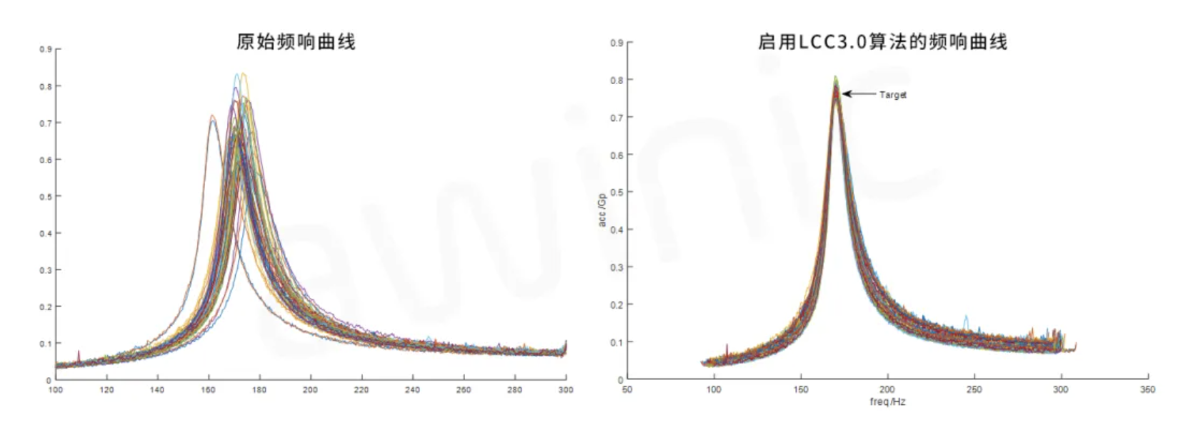 (LRA Consistency Calibration, LCC 3.0)由于受到材料、生产、工艺和指标卡控等因素的影响,即使是同批次的线性马达,其单体之间的差异也非常明显。我们进行了市面上主流线性马达的扫频测试,结果显示扫频的基频和振动量分布存在显著差异,这导致不同用户在使用后体验截然不同。然而,当我们使用AW86937FCR AW86938CSR驱动芯片并启用LCC3.0算法时,情况就完全不同了。我们进行了相同的扫频测试,发现不同单体之间的一致性大大提高。尽管马达单体之间存在较大差异,但有了它们的加持,用户之间的一致性得到显著提升,确保了统一的振动体验。