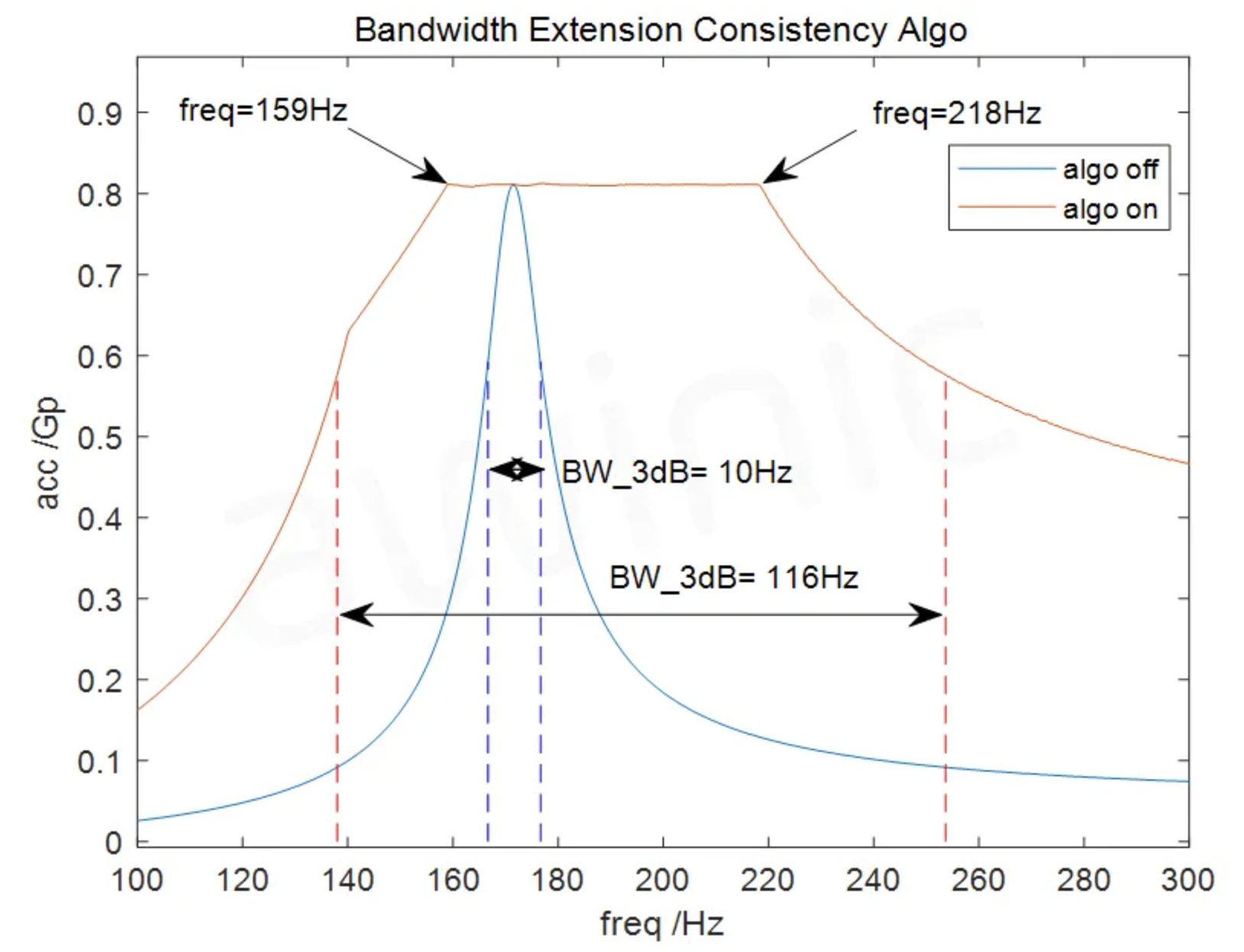 (Bandwidth Extension Algorithm, BEA)LRA作为典型的弹簧-振子系统,在额定电压驱动下,最大振动量出现在谐振频率f0处,而远离f0时振动量明显减弱。通常情况下,为了获得更强的振动效果,行业内常采用额定电压驱动,并选择f0频率或附近的频率进行振动。然而,这限制了触觉反馈的应用,因为不同频率产生不同的触感,如低频振动带来沉重感,中频振动带来冲击感,高频振动带来尖锐感。