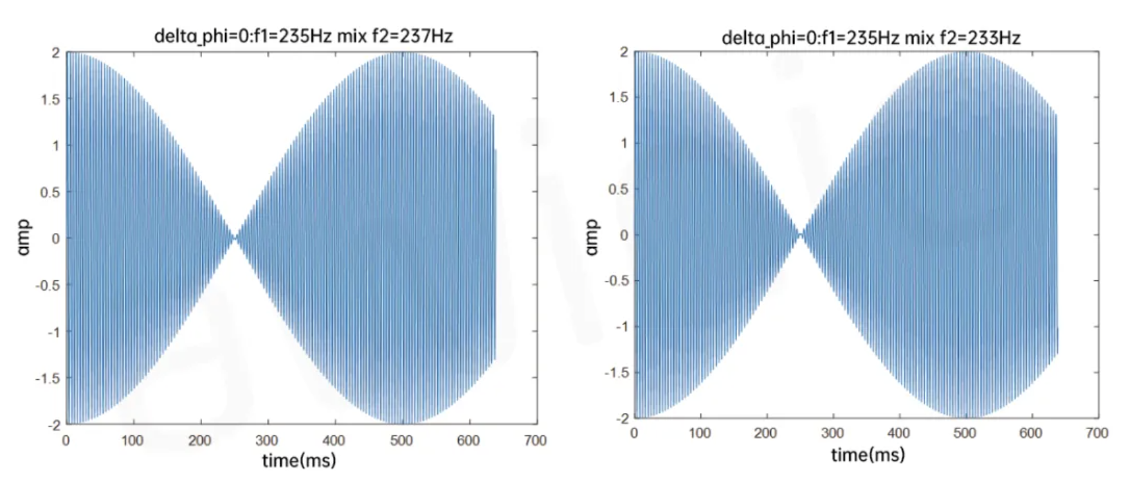 当δ=0时,总加速度为单个加速度2倍,如下右图当δ≠0且较小时,会有包络起伏,形成Beats的效果