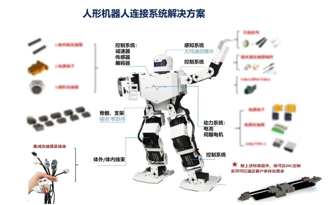 瑞可达为客户提供包括:电源连接(电源连接器及组件)、运动及运动控制连接(信号连接器及组件)、视觉与感知连接(射频与数据连接器及组件)、旋转连接器及组件(高寿命关节及360度无限旋转连接器)、高速大脑及域控连接(高速数据及光纤连接组件)、无线连接(多种机器人天线及射频传输)及相应的结构部件。