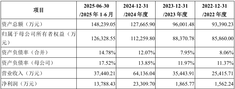 财务方面,于2022年度、2023年度、2024年度及2025年1-6月,公司实现营业收入分别约为2.54亿元、3.54亿元、6.41亿元、3.74亿元人民币;同期,公司净利润分别约为1562.24万元、1865.77万元、2.33亿元、1.38亿元人民币。