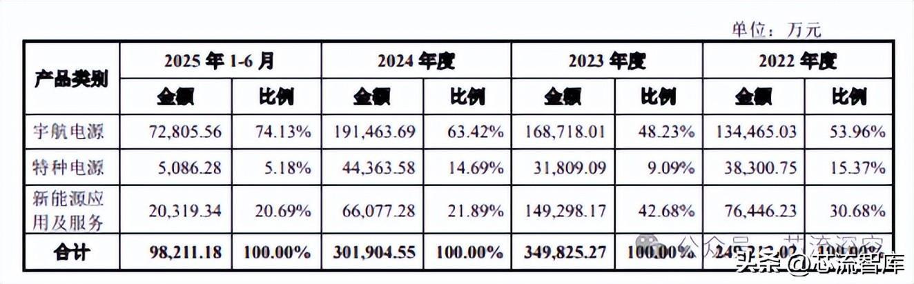 从业务构成看,宇航电源始终是主轴。报告期内该板块收入占比分别约为53.96%、48.23%、63.42%和74.13%,呈现出持续抬升趋势,而特种电源与新能源应用及服务收入占比则逐步下降。