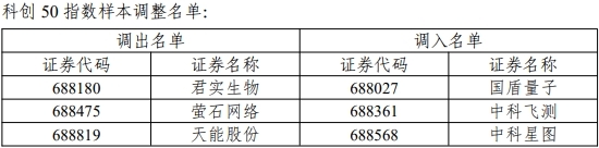 根据指数规则,上海证券交易所与中证指数有限公司决定调整科创50等指数样本,于2026年3月13日收市后生效。其中科创50指数更换3只样本,天能股份(688819.SH)等三只股票调出,中科星图(688568.SH)等三只股票调入。