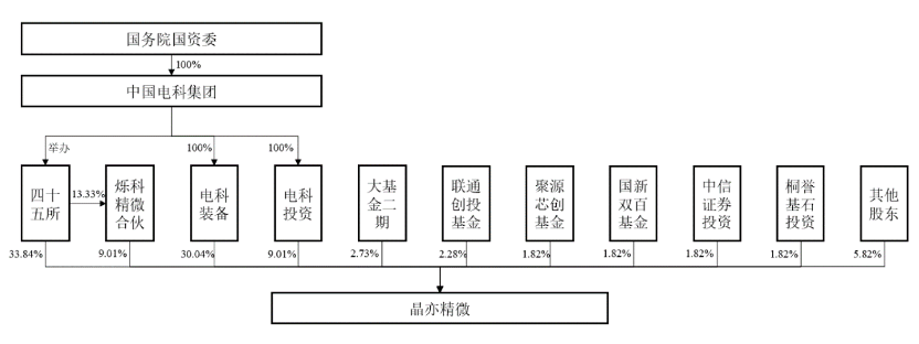 截至招股说明书签署日,四十五所为晶亦精微第一大股东,直接持有公司33.84%股份。烁科精微合伙为公司员工持股平台,持有9.01%股份;四十五所作为有限合伙人持有烁科精微合伙13.33%的财产份额,两者为一致行动人。因此,四十五所合计控制晶亦精微42.85%股份,为公司控股股东,中国电科集团为公司实际控制人。
