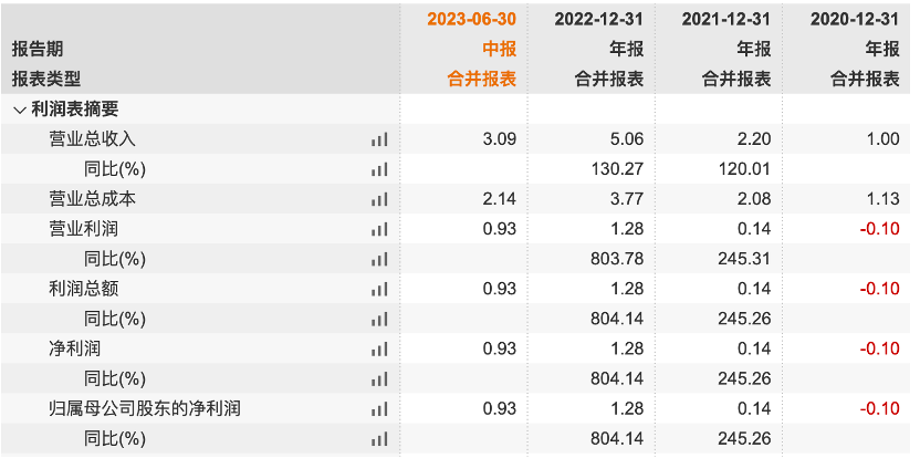 2020年-2023年上半年,晶亦精微营业收入分别为1.00亿元、2.20亿元、5.06亿元和3.09亿元,2021年和2022年同比增长了120.01%和130.27;同期归母净利润分别为-976.49万元、1418.40万元、1.28亿元和9330.20万元。