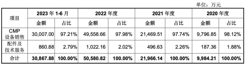 事实上,晶亦精微主营业务收入主要来源于CMP设备的销售。2020年-2023年上半年,晶亦精微CMP设备销售收入分别为0.98亿元、2.15亿元、4.96亿元和3.00亿元,占主营业务收入的比例分别为98.12%、97.74%、97.98%和97.21%。
