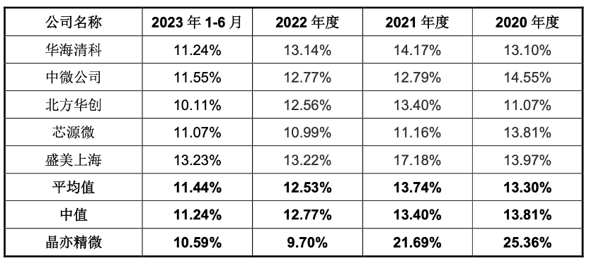 天天财经注意到,晶亦精微2022年起研发投入力度隐隐透露着“后继乏力”。2020年-2023年上半年,晶亦精微研发费用率分别为25.36%、21.69%、9.70%和10.59%;同行业可比公司平均水平分别为13.30%、13.74%、12.53%和11.44%。