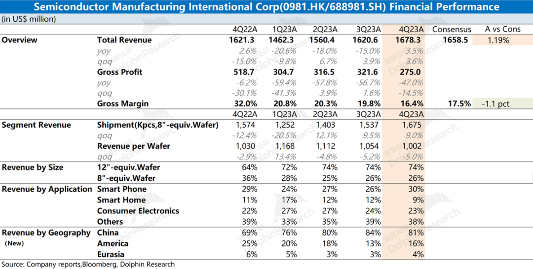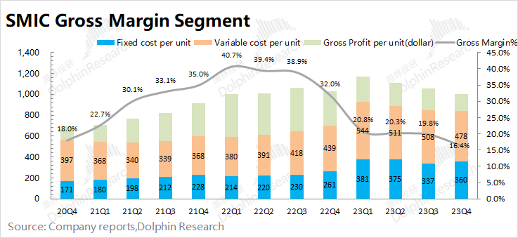 2023 年第四季度中芯国际的毛利率为16.4%,环比下降3.4pct,低于市场一致预期(17.5%)。