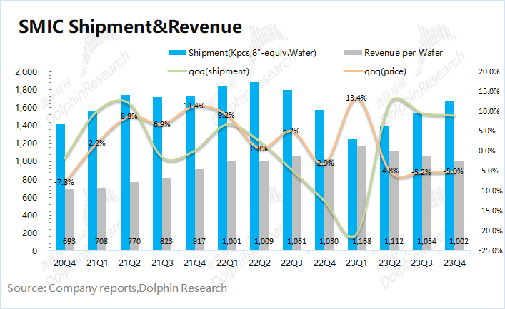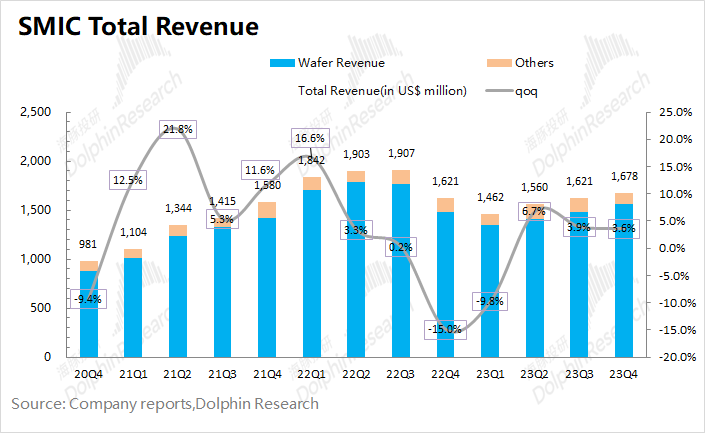 2023年第四季度中芯国际实现营收16.78亿美元,环比增加3.6%,小超指引预期(环比增长1-3%)。公司本季度的出货量继续回升,而价格端环比继续下滑。