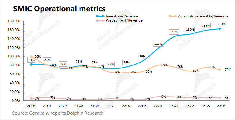 ③结合资产负债表中存货\u0026应收账款和收入之间的关系,本季度存货/收入和应收账款/收入分别为163%和70%。从营运指标的角度看,中芯国际的存货还在继续走高,创历史新高。