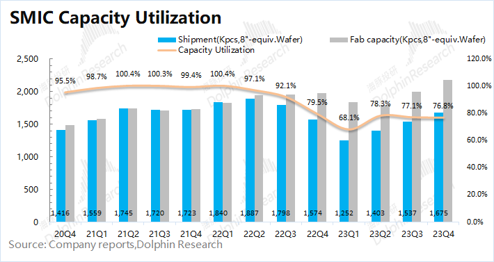2023年第四季度中芯国际的产能利用率76.8%,本季度公司的产能利用率继续维持低位。海豚君认为公司本季度的出货量有所提升,而产能利用率仍在低位,主要是受公司近期仍在逆周期扩产的影响。