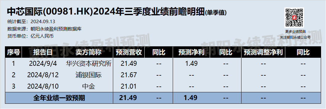 中芯国际三季度业绩预期如何?根据朝阳永续港股季度业绩前瞻数据,截至2024年9月13日,全市场共有多达3份券商研报出具了针对中芯国际的2024年三季度业绩前瞻预测数据。