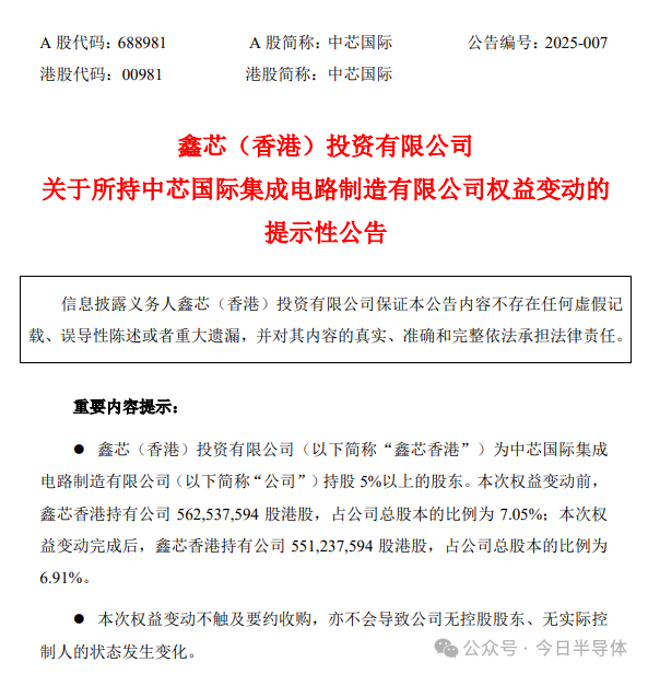公告显示,此次权益变动中,鑫芯香港共减持中芯国际1130万股,减持数量占中芯国际总股本的比例约为0.14%。权益变动后,鑫芯香港对中芯国际的持股比例从之前的7.05%降至6.91%。虽然此次减持比例相对不算大,但鉴于大基金一期在半导体行业的特殊地位和影响力,以及中芯国际在全球芯片制造领域的关键角色,这一举动无疑触动了市场的敏感神经。