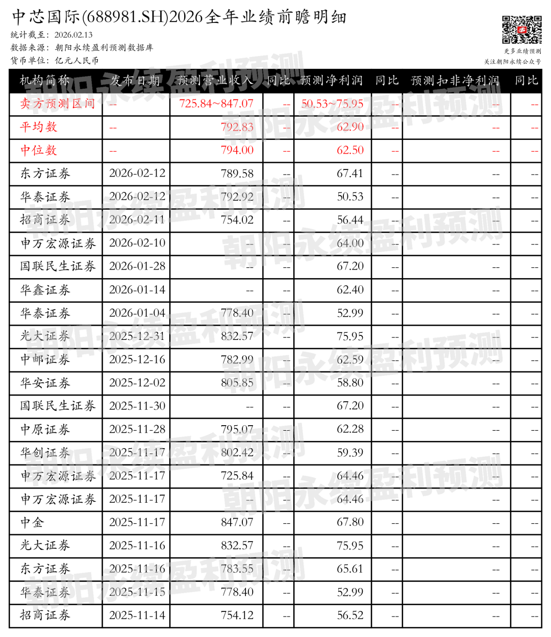 截至2026年02月13日,根据朝阳永续季度业绩前瞻数据:
