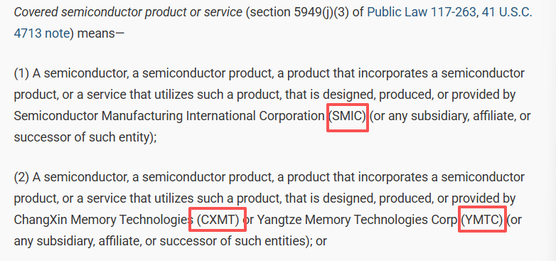 根据拟议规则,被禁止的“受覆盖半导体产品和服务”主要包括由中芯国际(SMIC)、长江存储(YMTC)、长鑫存储(CXMT)及其子公司、关联方,或被认定与“受关注外国政府”存在关联的其他实体所提供的半导体产品及服务。规则明确,联邦机构不得采购或获取任何包含此类半导体的电子产品或服务,也不得采购用于关键系统的、依赖相关半导体的电子设备。