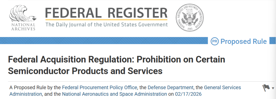 2月17日,美国联邦采购政策办公室(OFPP)、国防部(DoD)、总务管理局(GSA)及美国国家航空航天局(NASA)联合在《联邦公报》发布拟议规则,拟修订《联邦采购条例》,禁止联邦机构采购或使用由特定中国半导体企业设计、生产的半导体产品及相关服务,以落实《2023 财年詹姆斯?M?英霍夫国防授权法案》(NDAA)第 5949 条的相关要求。