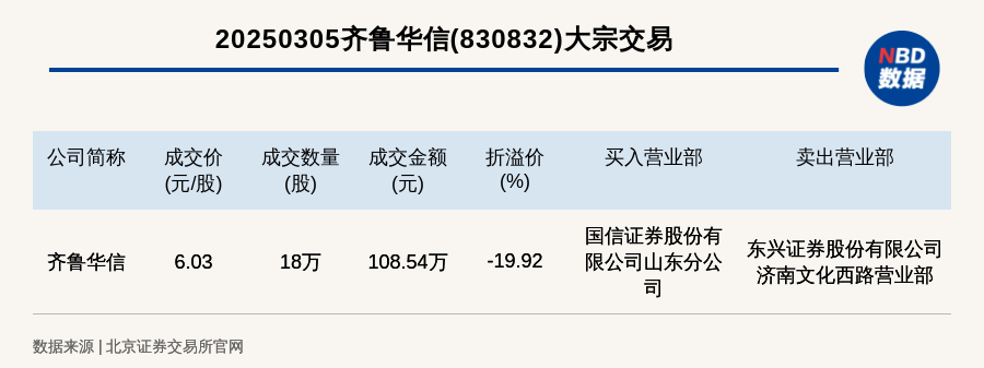2025年3月5日,北交所上市公司齐鲁华信(830832,收盘价:7.53元)发生一笔大宗交易,成交价6.03元/股,成交数量18万股,成交金额108.54万元,折价19.92%。买入营业部是国信证券股份有限公司山东分公司,卖出营业部是东兴证券股份有限公司济南文化西路营业部。