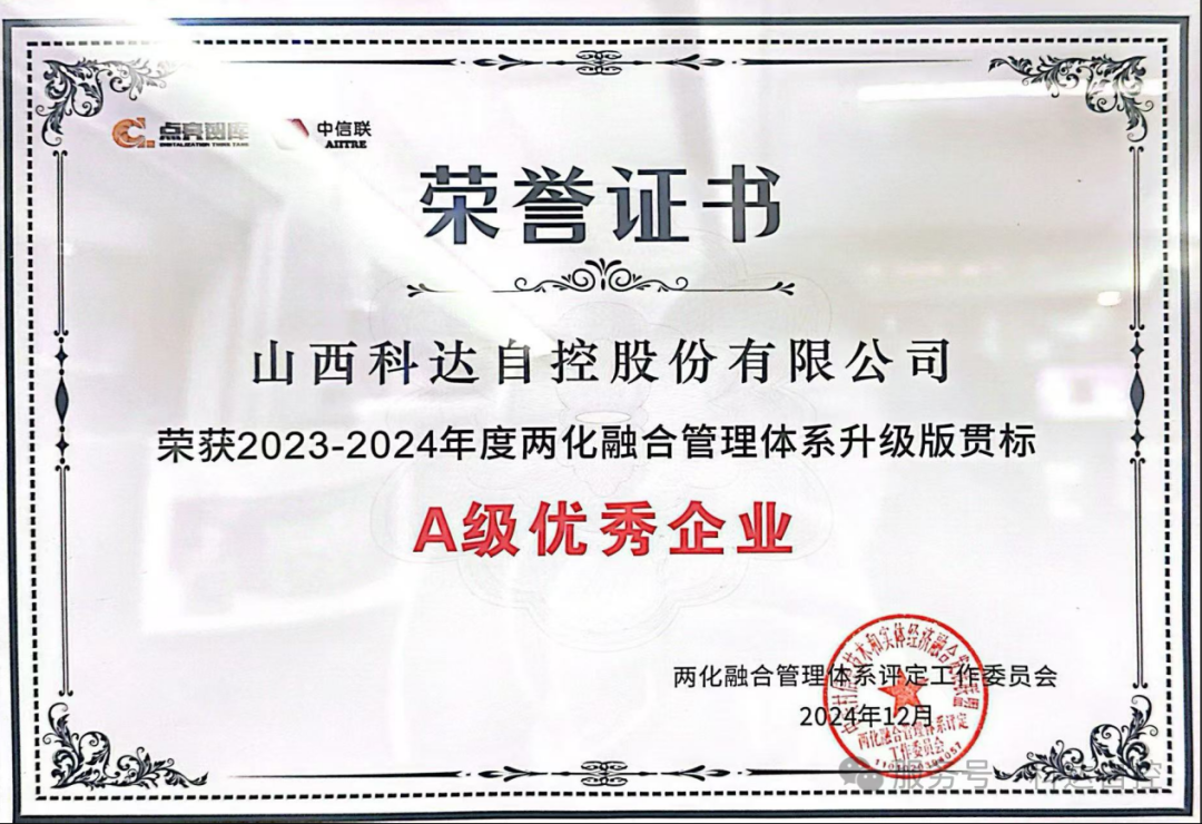 近日,由中关村信息技术和实体经济融合发展联盟主办的2024年两化融合管理体系升级版贯标工作推进会在河北雄安新区召开,会议发布了2023—2024年度全国两化融合管理体系优秀成果,山西科达自控股份有限公司获“2023—2024年度两化融合管理体系升级版贯标A级优秀企业”荣誉称号。