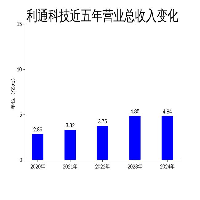 2024年,利通科技的营业总收入为4.84亿元,同比减少0.32%,虽然降幅不大,但这是公司近年来首次出现营收下滑。更为严峻的是,归属净利润同比下降19.82%,扣非净利润同比下降21.31%,显示出公司在盈利能力上的显著退步。与2023年相比,2024年的净利润下滑幅度较大,2023年公司净利润同比增长60.78%,而2024年则出现了近20%的下滑。