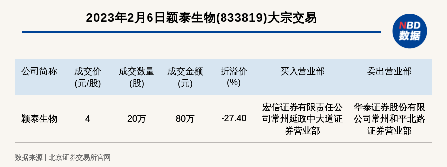 2023年2月6日,北交所上市公司颖泰生物(833819)发生一笔大宗交易,成交价4元/股,成交数量20万股,成交金额80万元,折价27.4%。买入营业部是宏信证券有限责任公司常州延政中大道证券营业部,卖出营业部是华泰证券股份有限公司常州和平北路证券营业部。
