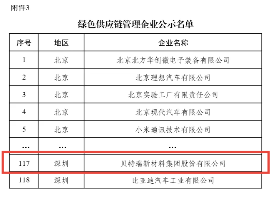 多年来,贝特瑞积极构建绿色供应链体系,扎实做好绿色供应链战略规划,实施绿色供应商管理,在绿色生产、绿色回收、供应商管理平台建设和绿色信息披露等方面持续完善。此次入选“绿色供应链管理企业”名单,是对贝特瑞在绿色供应链建设方面努力的肯定。