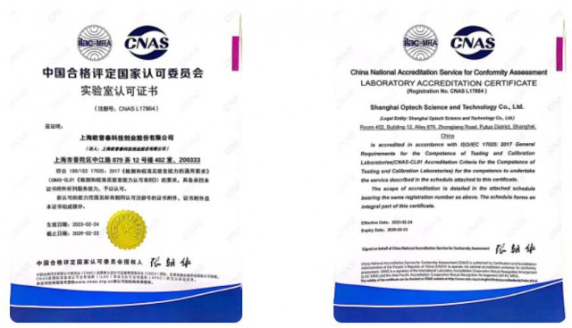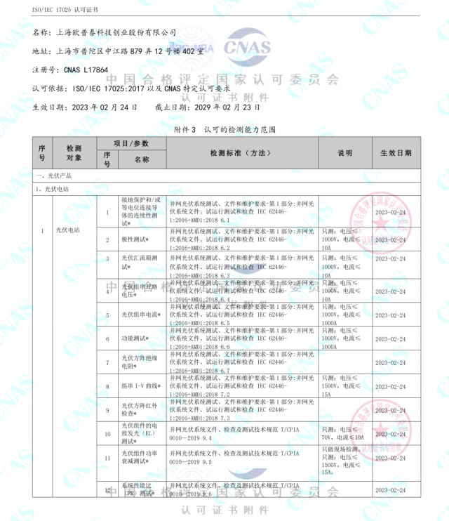 欧普泰光伏电站检测技术中心获得颁发的CNAS中英文认可证书