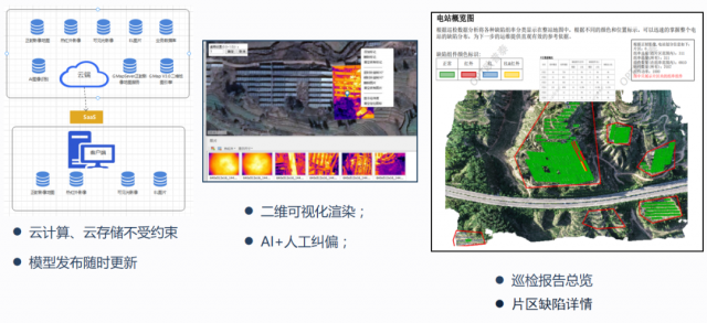 电站云平台基于SaaS架构,通过云计算、云部署,电站运维方可以随时随地上传图片进行AI云端推演,不受场地限制,缺陷筛查效率大大提升;图片分析结束后,可一键出具报告,对整个片区概况、局部片区的详情以及缺陷统计分析进行查看。