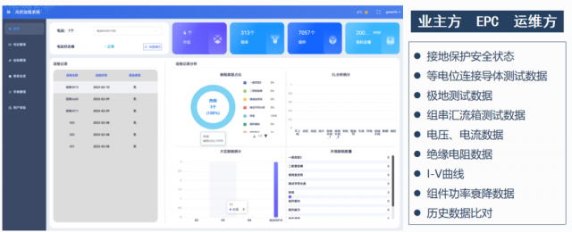 在此基础上,还可以接入一系列的测试数据,如接地保护状态,等电位连接导体测试数据,极地测试数据,组串汇流箱测试数据,电压、电流数据,绝缘电阻数据,I-V曲线,组件功率衰降数据,以及对历史数据进行比对,形成光伏电站的工业互联网平台。