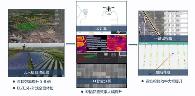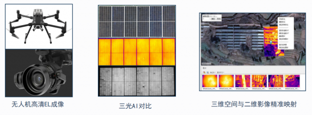 无人机自动巡航精准自动对焦、高清EL成像,拍摄的二维影像与实际的三维地形地貌精准映射,实现对EL、红外、外观全面体检,巡检效率大大提升;