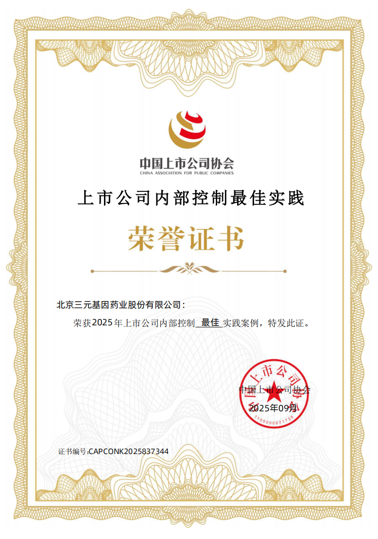 2025 年 9 月 22 日,由中国上市公司协会组织的“2025 年上市公司内部控制最佳实践案例”结果发布和交流活动在北京隆重举行。发布会上,北京三元基因药业股份有限公司从众多上市公司中脱颖而出,获评“2025 年上市公司内部控制最佳实践案例”奖项。