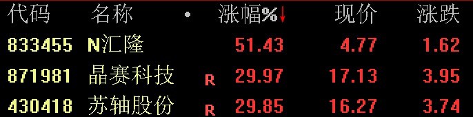 北交所201只个股中,今日有129只个股上涨,58只个股下跌,其中N汇隆(BJ833455,股价4.77元,市值8.2亿元)、晶赛科技(BJ871981,股价17.13元,市值13亿元)涨幅靠前,分别上涨了51.43%、29.97%;下跌方面,云创数据(BJ835305,股价21.36元,市值28亿元)下跌了8.64%。