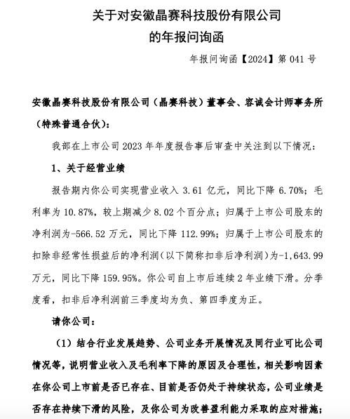6月18日,北京证券交易所下发关于对安徽晶赛科技股份有限公司(以下简称“晶赛科技”或“公司”)的年报问询函。问询函要求晶赛科技说明营业收入及毛利率下降的原因及合理性,相关影响因素在晶赛科技上市前是否已存在、目前是否仍处于持续状态,公司业绩是否存在持续下滑的风险,及晶赛科技为改善盈利能力采取的应对措施等。