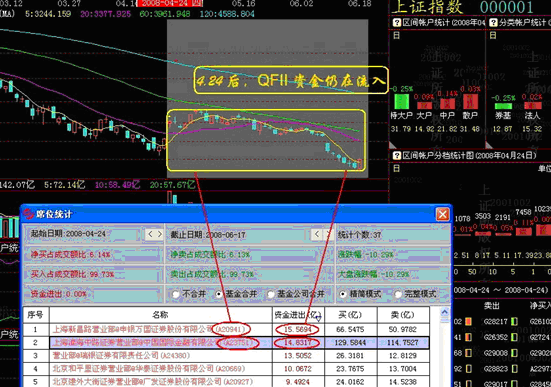 4月24日至6月18日,QFII的A23751和A20941净买近30.4亿,可以看出QFII资金一直在持续流入,并没有抄完大底后出逃的迹象。