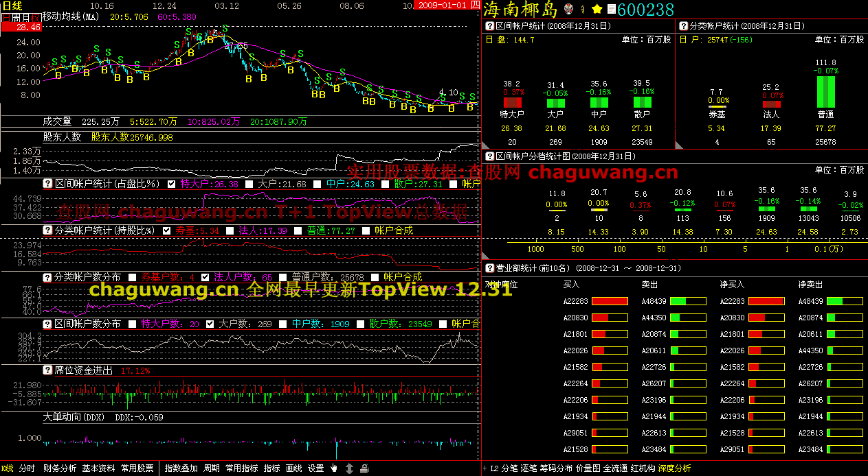 由于上海证券交易所停止发布TopView赢富数据,查股网以后将发布600238 海南椰岛的大智慧SuperView超赢数据和指南针TotalView全赢主力雷达静态版数据作为替代.