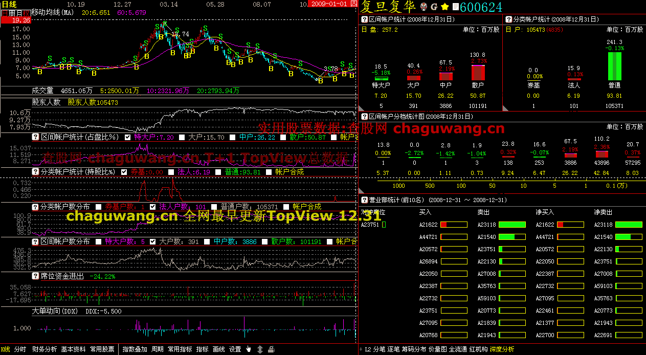 由于上海证券交易所停止发布TopView赢富数据,查股网以后将发布600624 复旦复华的大智慧SuperView超赢数据和指南针TotalView全赢主力雷达静态版数据作为替代.
