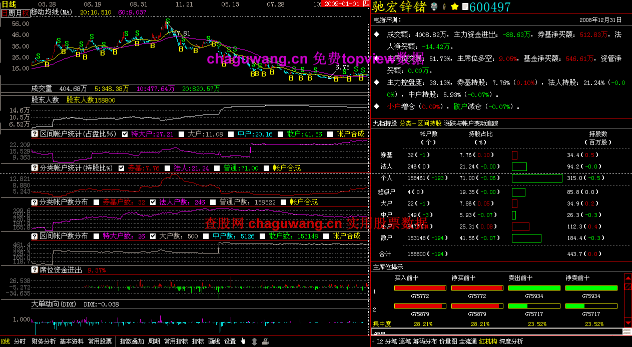 由于上海证券交易所停止发布TopView赢富数据,查股网以后将发布600497 驰宏锌锗的大智慧SuperView超赢数据和指南针TotalView全赢主力雷达静态版数据作为替代.