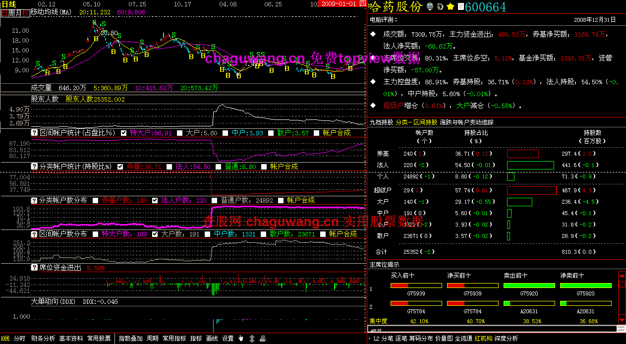 查股网将保留了哈药股份 600664 2008年8月1号之后所有的topview赢富持仓帐户数和席位数据(查询地址为: