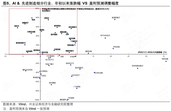 其次,寻找具备独立景气、基本面受油价上行影响较小的板块。具备产业趋势和政策加持的AI、先进制造仍是最典型的领域,这些板块在短期集中定价地缘风险带来的折价后,由于自身基本面受油价影响较小,后续反而有望凭借独立景气,成为地缘风险环境下相对受益的领域。通过年初以来盈利预测上修情况筛选细分方向,主要集中在: